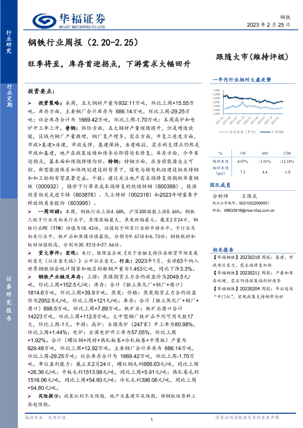 【华福证券】【20230225】20230225-华福证券-钢铁行业周报:旺季将至,库存首迎拐点,下游需求大幅回升-17页
