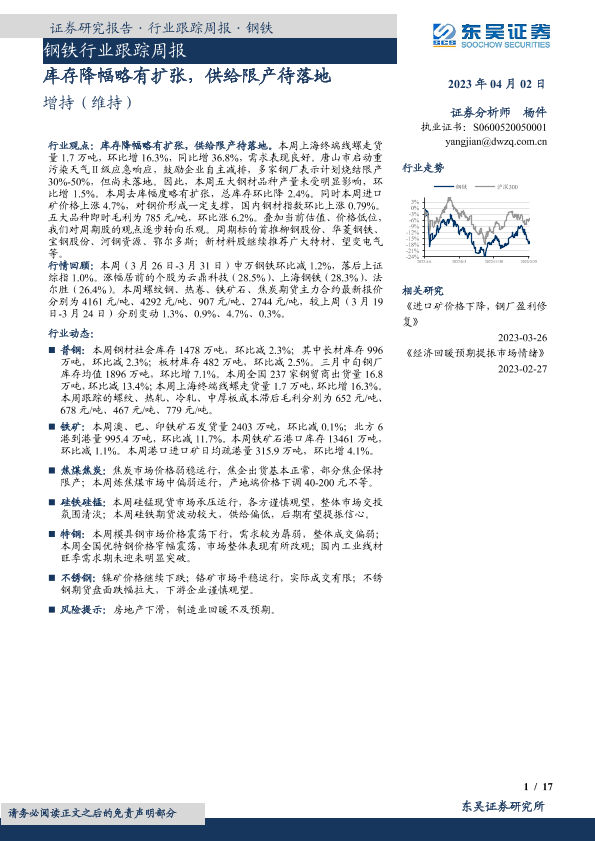 【东吴证券】【20230402】20230402-东吴证券-钢铁行业跟踪周报:库存降幅略有扩张,供给限产待落地-17页