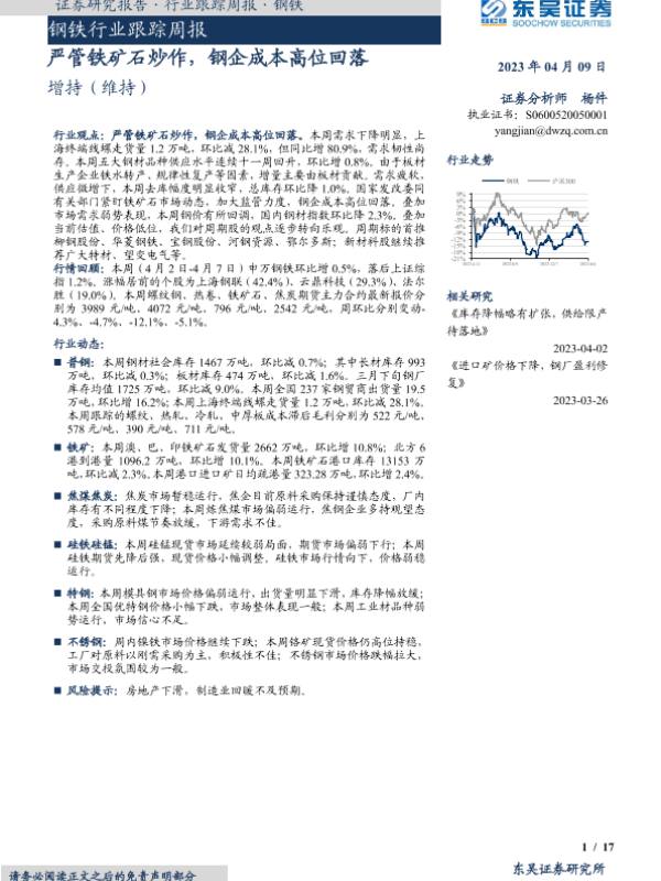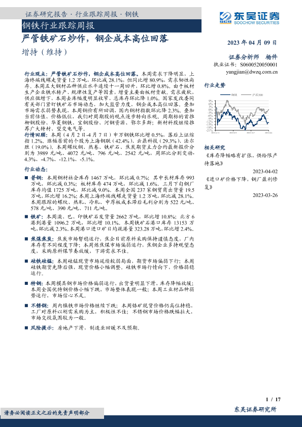 【东吴证券】【20230409】20230409-东吴证券-钢铁行业跟踪周报:严管铁矿石炒作,钢企成本高位回落-17页
