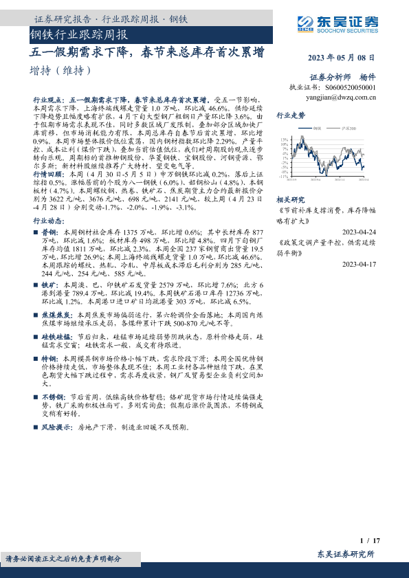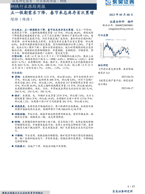 【东吴证券】【20230508】20230508-东吴证券-钢铁行业跟踪周报:五一假期需求下降,春节来总库存首次累增-17页