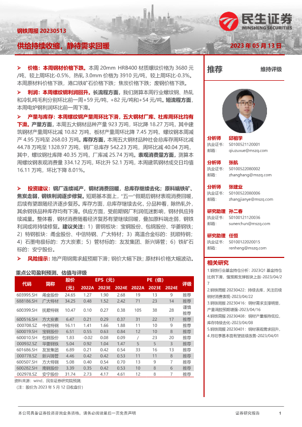 【民生证券】【20230513】20230513-民生证券-钢铁周报:供给持续收缩,静待需求回暖-20页