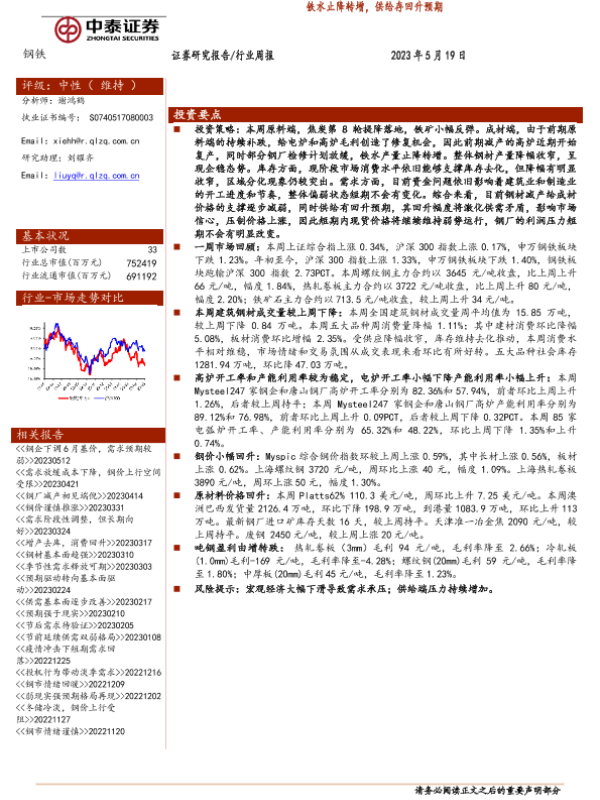 【中泰证券】【20230519】钢铁行业周报:铁水止降转增,供给存回升预期-14页