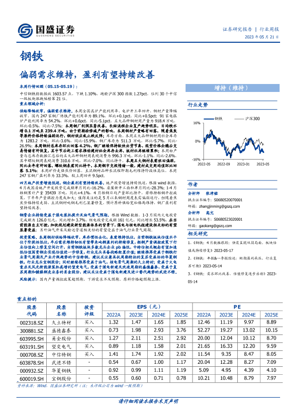 【国盛证券】【20230521】20230521-国盛证券-钢铁行业周报:偏弱需求维持,盈利有望持续改善-16页