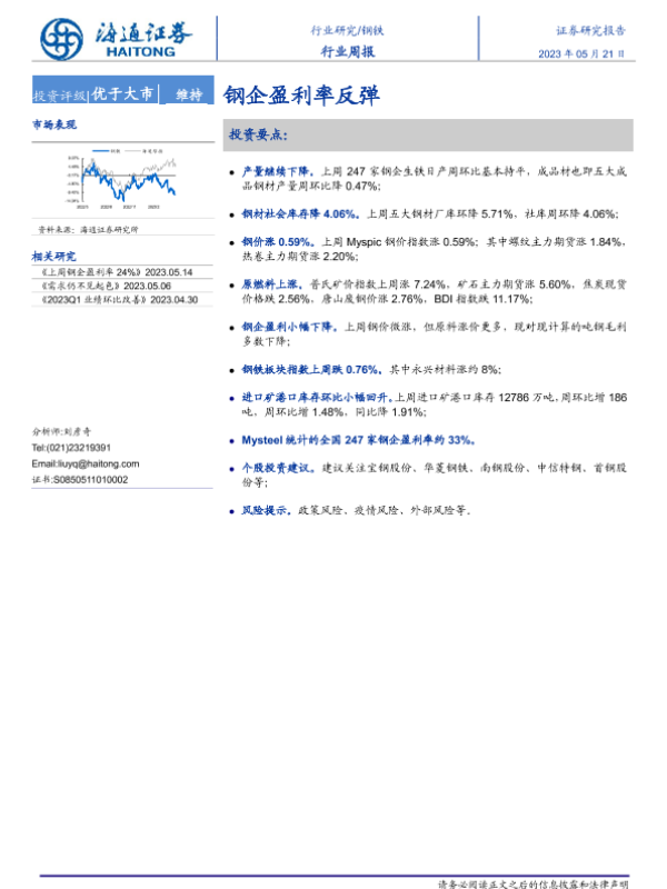【海通证券】【20230521】20230521-海通证券-钢铁行业周报:钢企盈利率反弹-14页