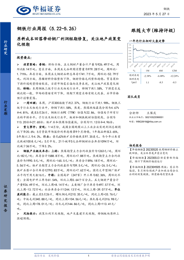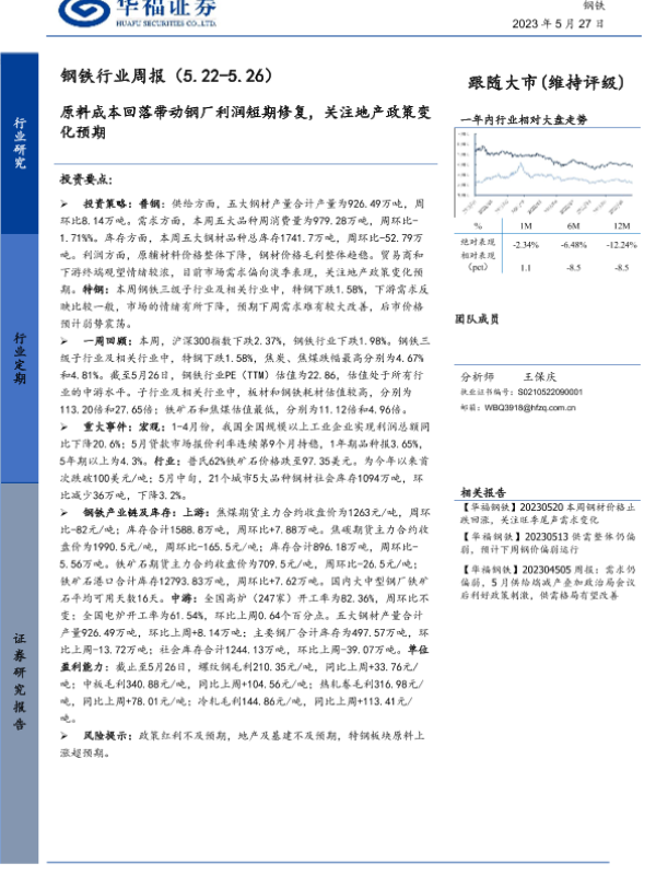 【华福证券】【20230527】20230527-华福证券-钢铁行业周报:原料成本回落带动钢厂利润短期修复,关注地产政策变化预期-16页