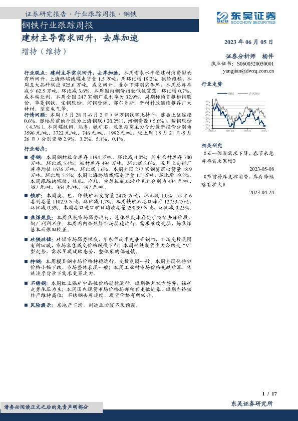 【东吴证券】【20230605】20230605-东吴证券-钢铁行业跟踪周报:建材主导需求回升,去库加速-17页