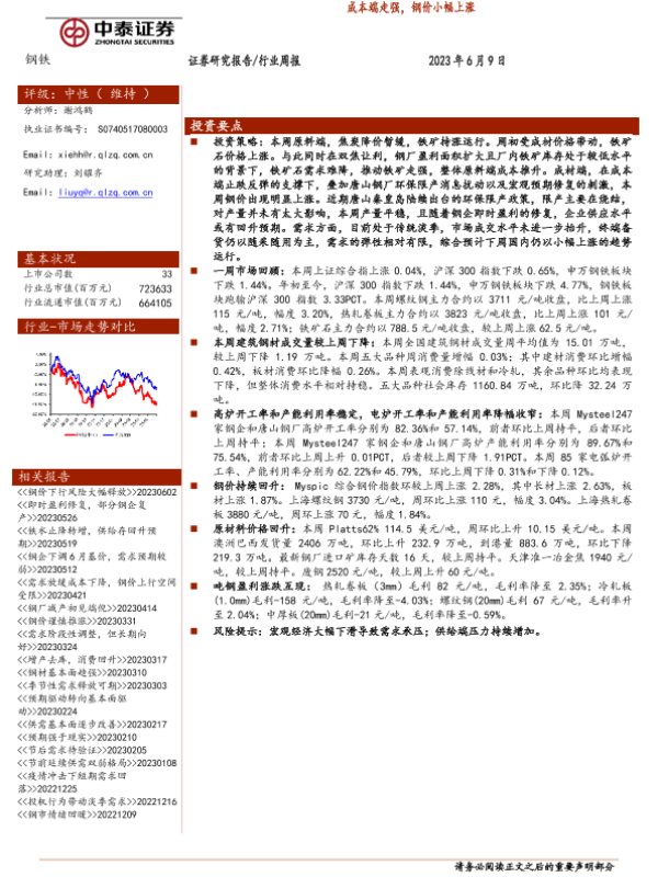 【中泰证券】【20230609】20230609-中泰证券-钢铁行业周报:成本端走强,钢价小幅上涨-14页