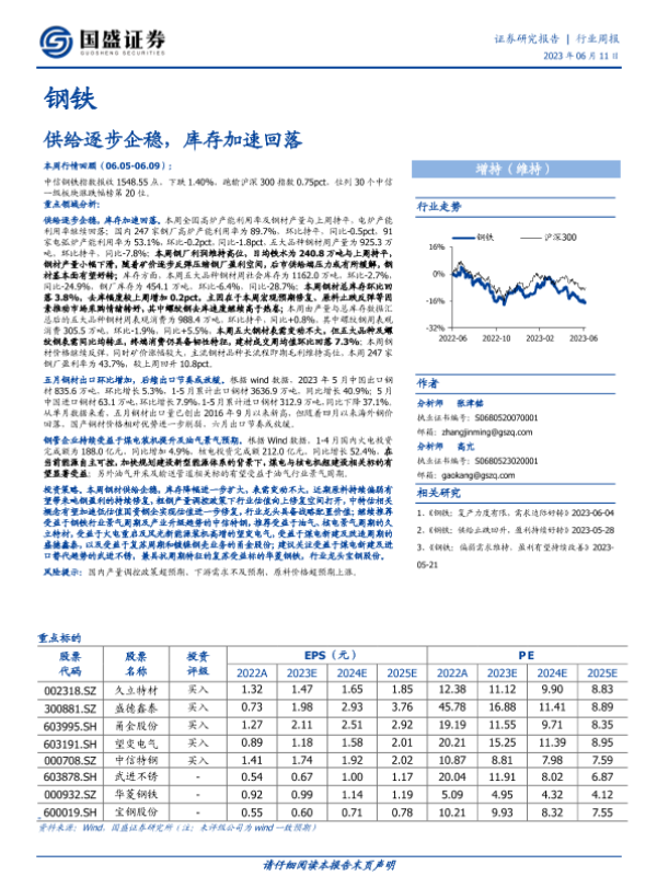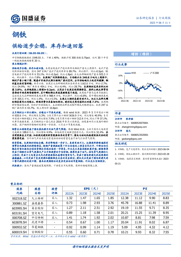 【国盛证券】【20230611】20230611-国盛证券-钢铁行业周报:供给逐步企稳,库存加速回落-16页