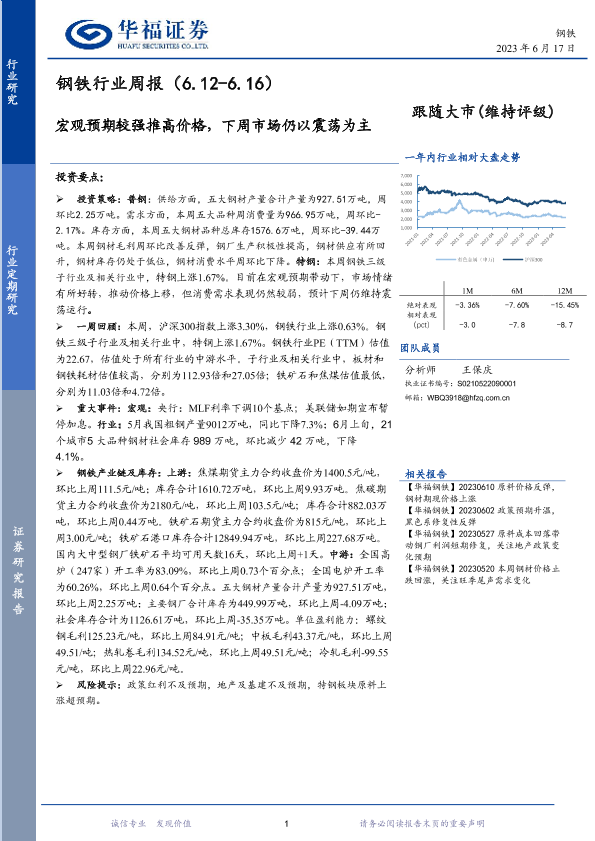 【华福证券】【20230617】20230617-华福证券-钢铁行业周报:宏观预期较强推高价格,下周市场仍以震荡为主-15页