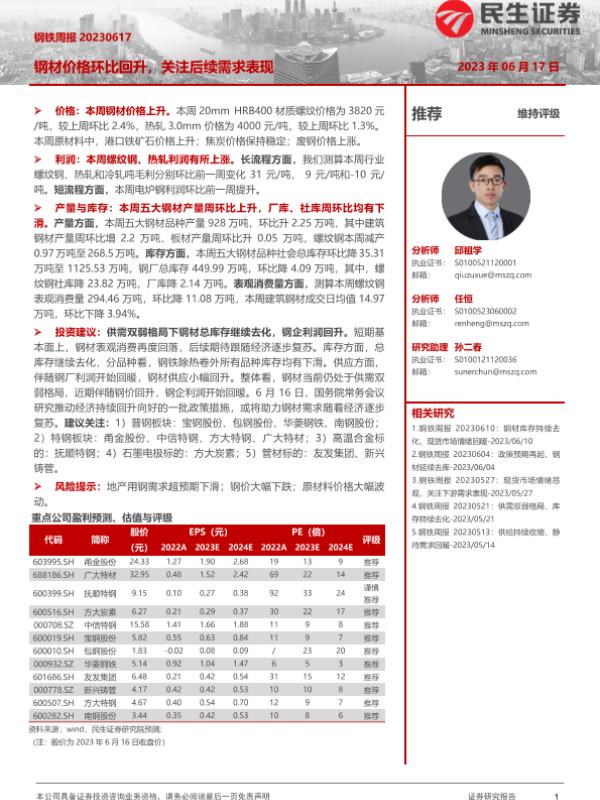 【民生证券】【20230617】20230617-民生证券-钢铁周报:钢材价格环比回升,关注后续需求表现-20页