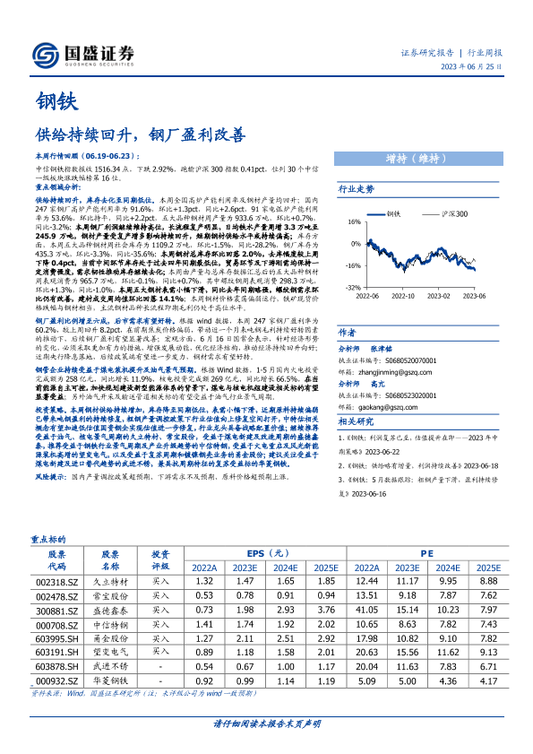 【国盛证券】【20230625】20230625-国盛证券-钢铁行业周报:供给持续回升,钢厂盈利改善-16页