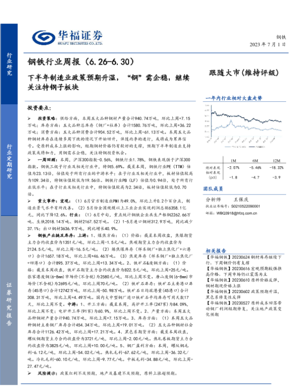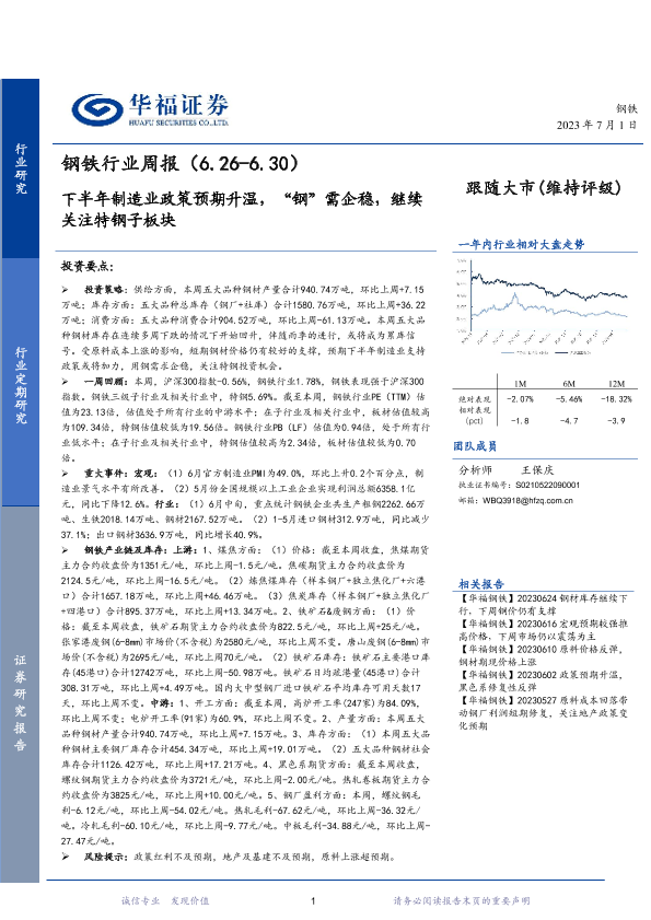 【华福证券】【20230701】20230701-华福证券-钢铁行业周报:下半年制造业政策预期升温,“钢”需企稳,继续关注特钢子板块-15页