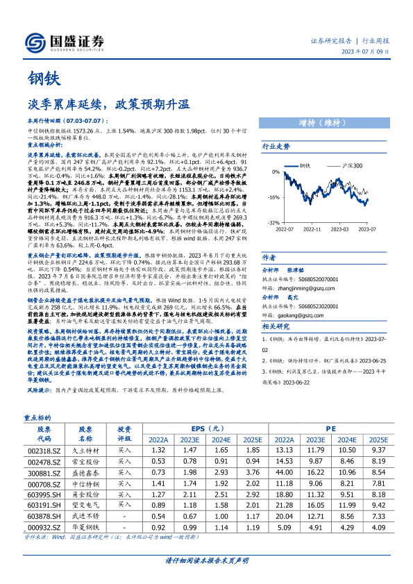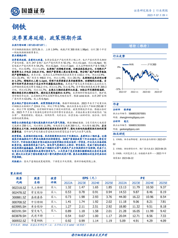 【国盛证券】【20230709】20230709-国盛证券-钢铁行业周报:淡季累库延续,政策预期升温-17页