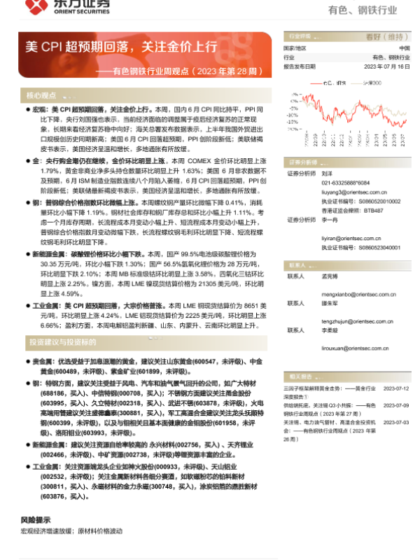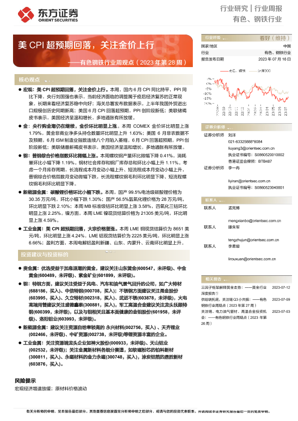 【东方证券】【20230716】20230716-东方证券-有色钢铁行业周观点(2023年第28周):美CPI超预期回落,关注金价上行-39页