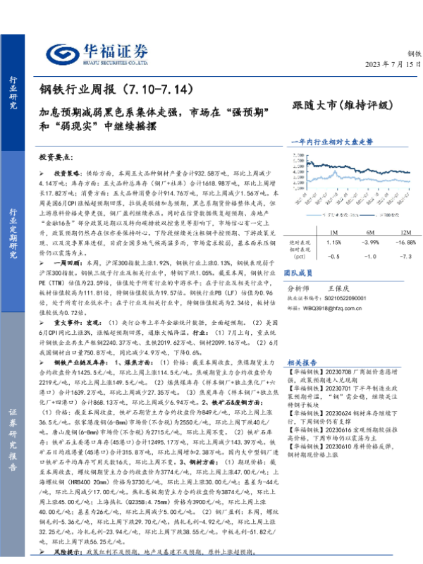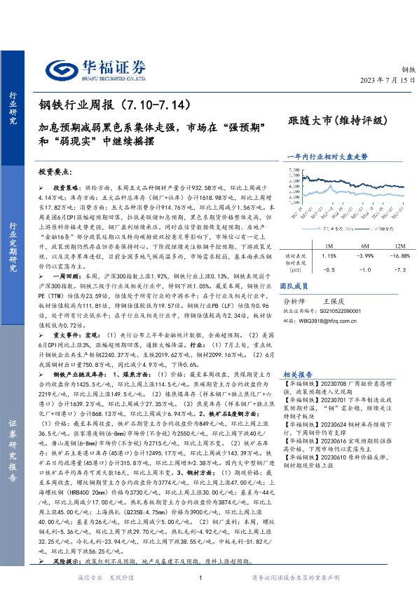 【华福证券】【20230715】20230715-华福证券-钢铁行业周报:加息预期减弱黑色系集体走强,市场在“强预期”和“弱现实”中继续摇摆-16页
