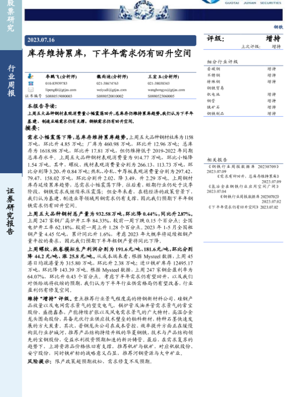 【国泰君安证券】【20230716】20230716-国泰君安-钢铁行业周报:库存维持累库,下半年需求仍有回升空间-26页
