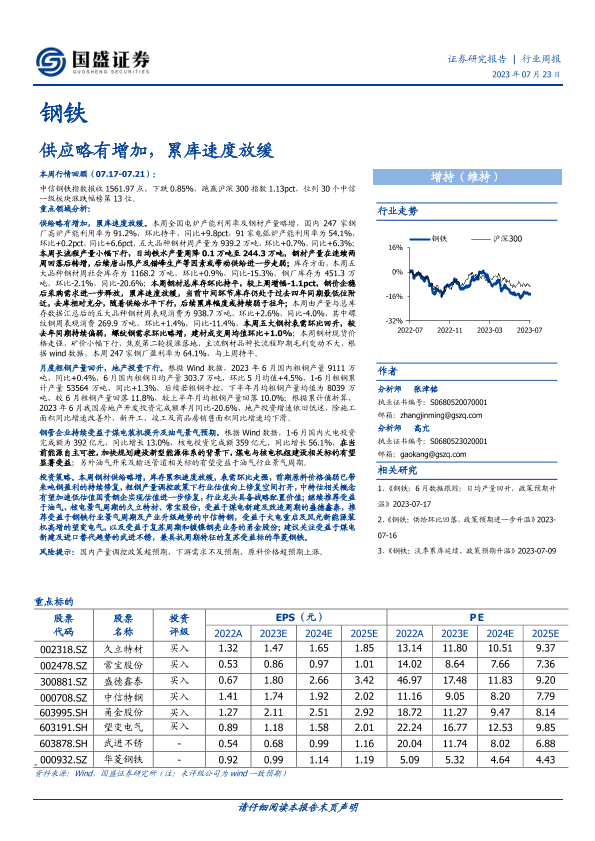 【国盛证券】【20230723】20230723-国盛证券-钢铁行业周报:供应略有增加,累库速度放缓-16页