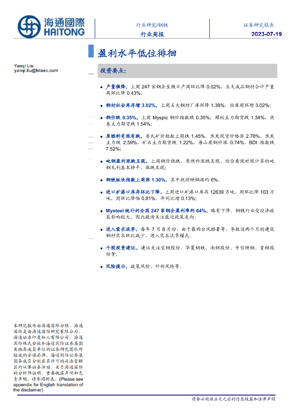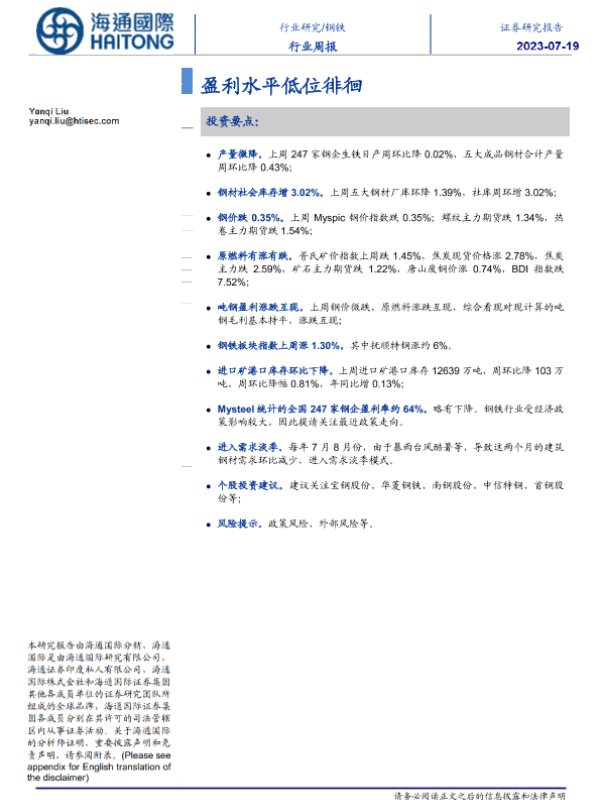【海通国际】【20230708】20230719-海通国际-钢铁行业周报:盈利水平低位徘徊-21页