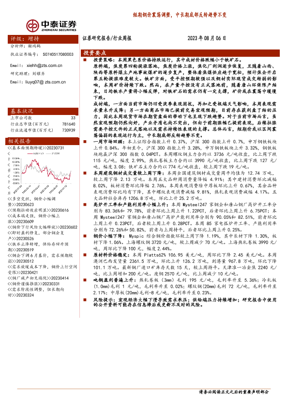 【中泰证券】【20230806】20230806-中泰证券-钢铁行业周报:短期钢价震荡调整,中长期底部反转趋势不变-14页