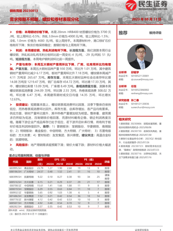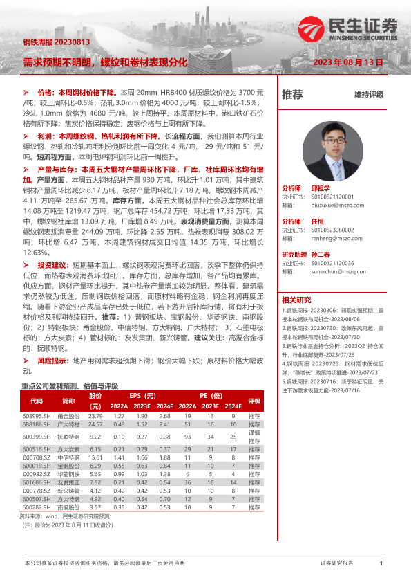 【民生证券】【20230813】20230813-民生证券-钢铁周报:需求预期不明朗,螺纹和卷材表现分化-20页