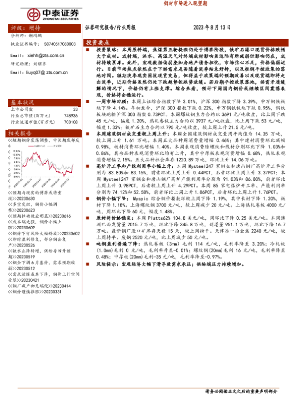 【中泰证券】【20230813】20230813-中泰证券-钢铁行业周报:钢材市场进入观望期-14页