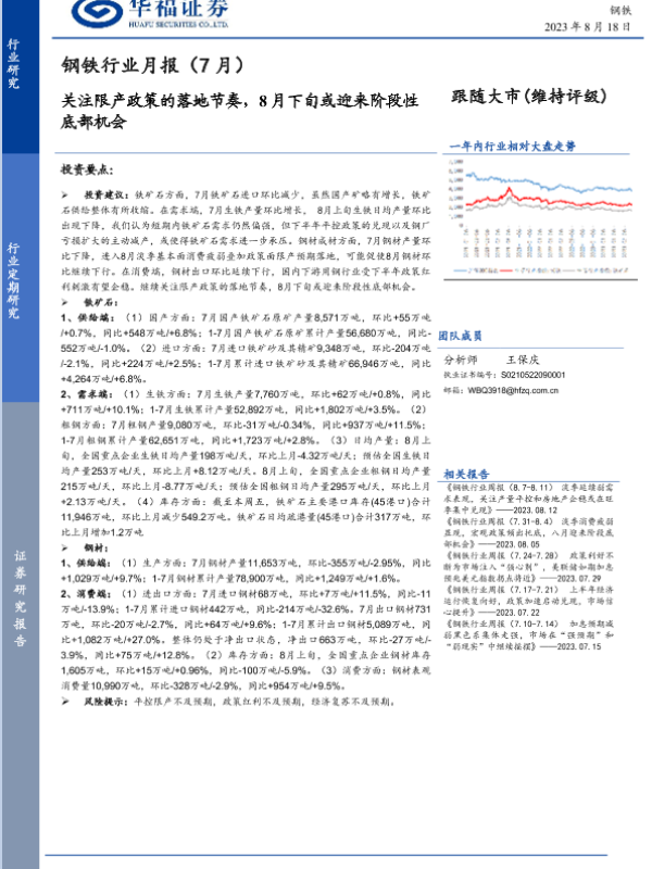 【华福证券】【20230818】钢铁行业月报(7月):关注限产政策的落地节奏,8月下旬或迎来阶段性底部机会-11页