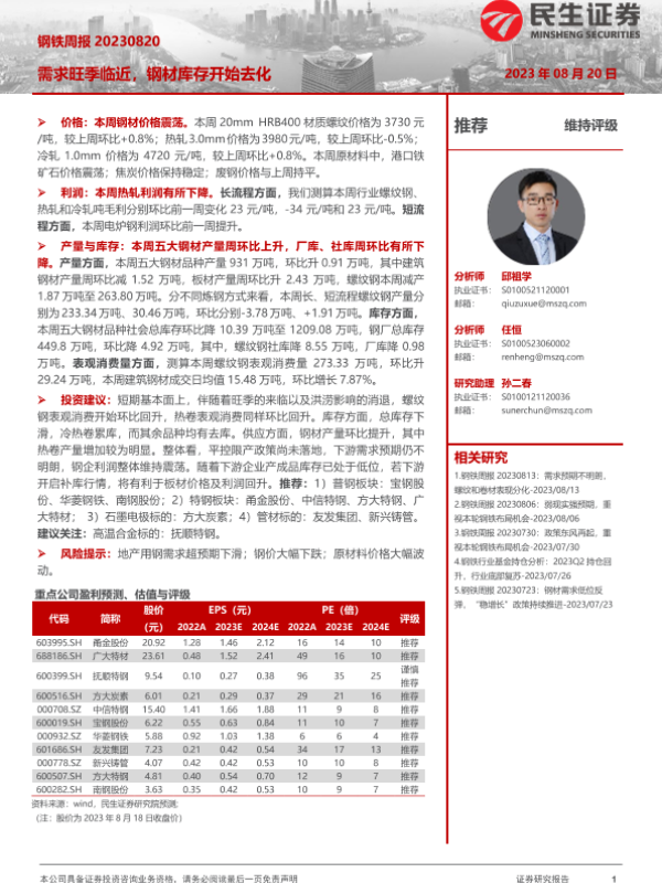 【民生证券】【20230820】20230820-民生证券-钢铁周报:需求旺季临近,钢材库存开始去化-20页