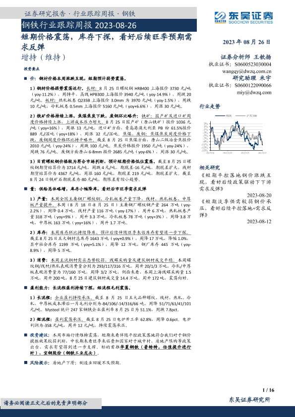 【东吴证券】【20230826】20230826-东吴证券-钢铁行业跟踪周报:短期价格震荡,库存下探,看好后续旺季预期需求反弹-16页