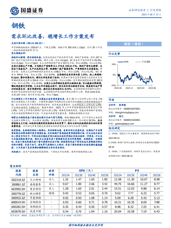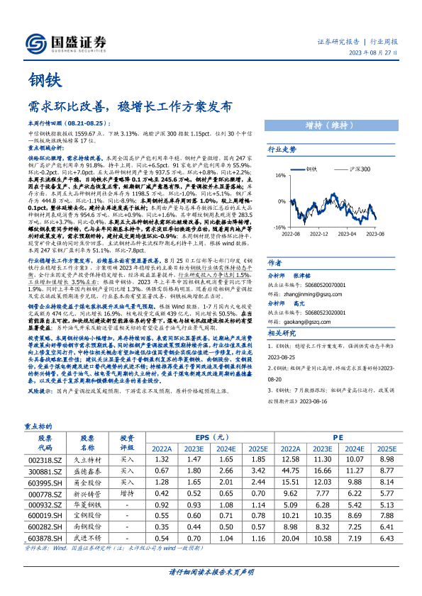 【国盛证券】【20230827】20230827-国盛证券-钢铁行业周报:需求环比改善,稳增长工作方案发布-17页