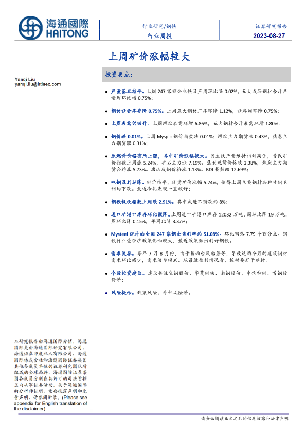 【海通国际】【20230827】20230827-海通国际-钢铁行业周报:上周矿价涨幅较大-21页