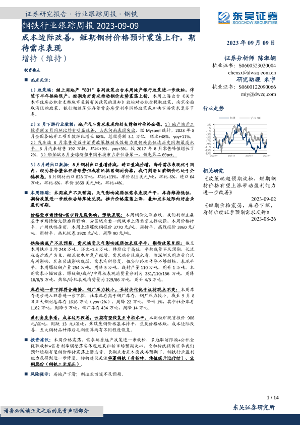 【东吴证券】【20230909】20230909-东吴证券-钢铁行业跟踪周报:成本边际改善,短期钢材价格预计震荡上行,期待需求表现-14页