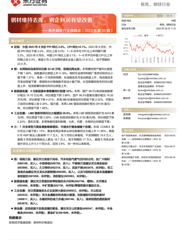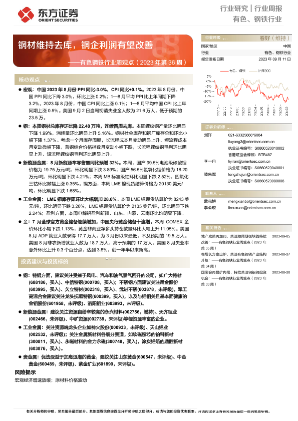 【东方证券】【20230911】20230911-东方证券-有色钢铁行业周观点(2023年第36周):钢材维持去库,钢企利润有望改善-40页