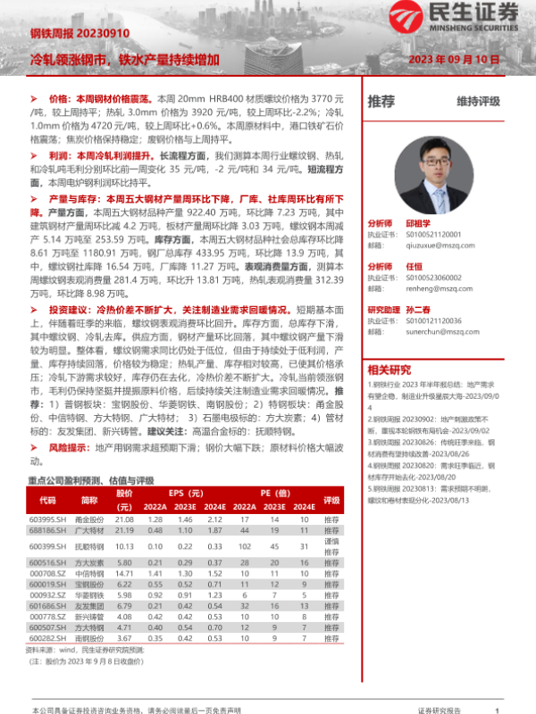 【民生证券】【20230910】20230910-民生证券-钢铁周报:冷轧领涨钢市,铁水产量持续增加-20页