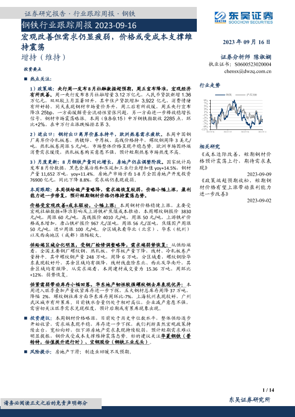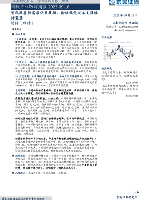 【东吴证券】【20230916】20230916-东吴证券-钢铁行业跟踪周报:宏观改善但需求仍显疲弱,价格或受成本支撑维持震荡-14页