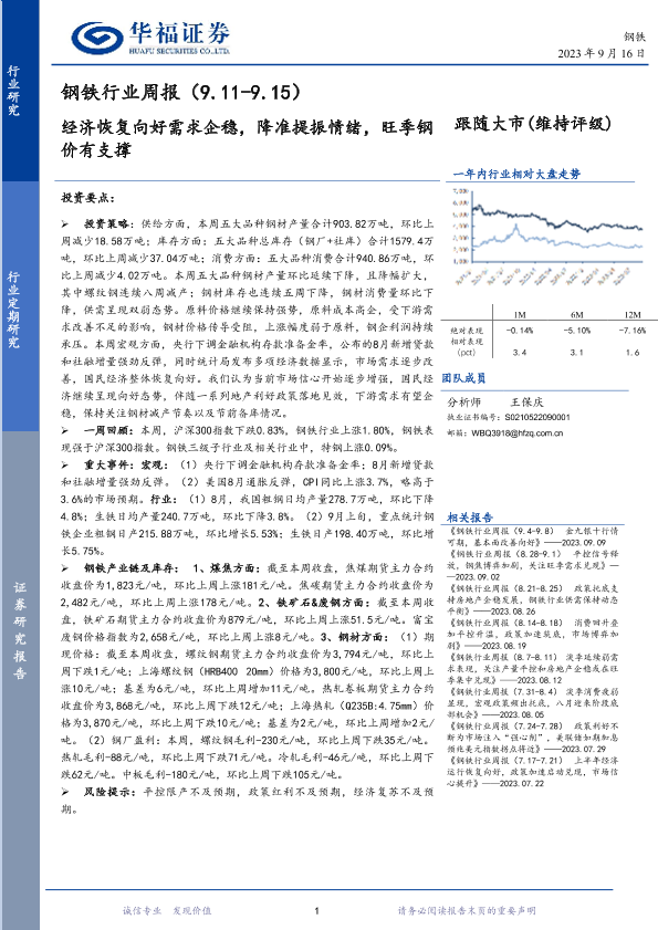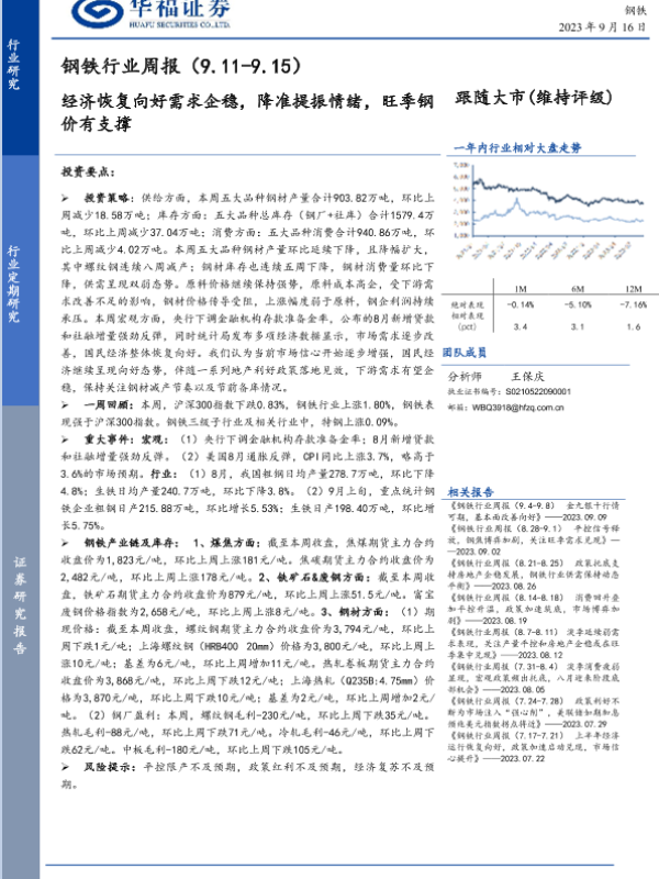 【华福证券】【20230916】20230916-华福证券-钢铁行业周报:经济恢复向好需求企稳,降准提振情绪,旺季钢价有支撑-13页