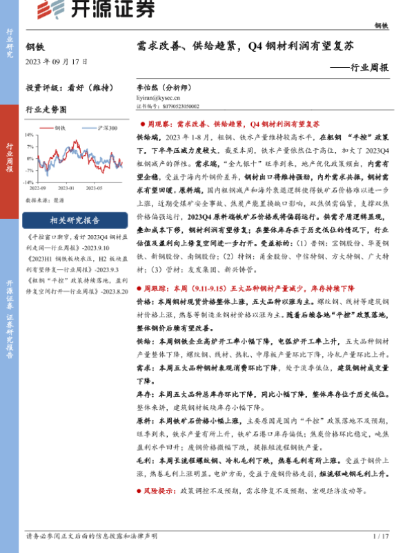 【开源证券】【20230917】20230917-开源证券-钢铁行业周报:需求改善、供给趋紧,Q4钢材利润有望复苏-17页
