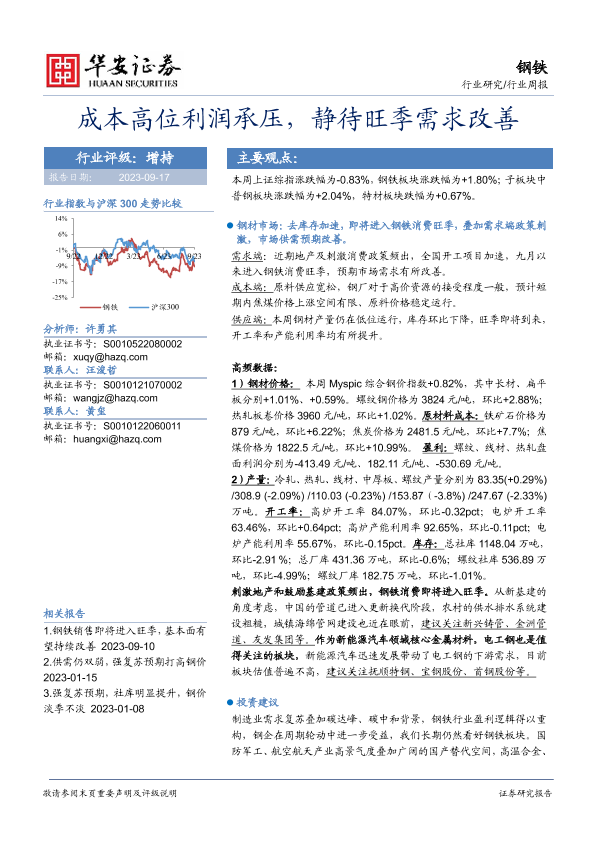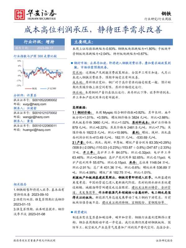 【华安证券】【20230917】20230917-华安证券-钢铁行业周报:成本高位利润承压,静待旺季需求改善-13页