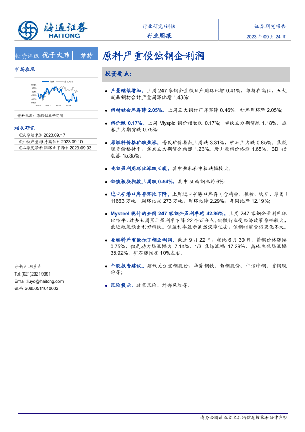 【海通证券】【20230924】20230924-海通证券-钢铁行业周报:原料严重侵蚀钢企利润-15页