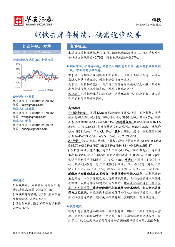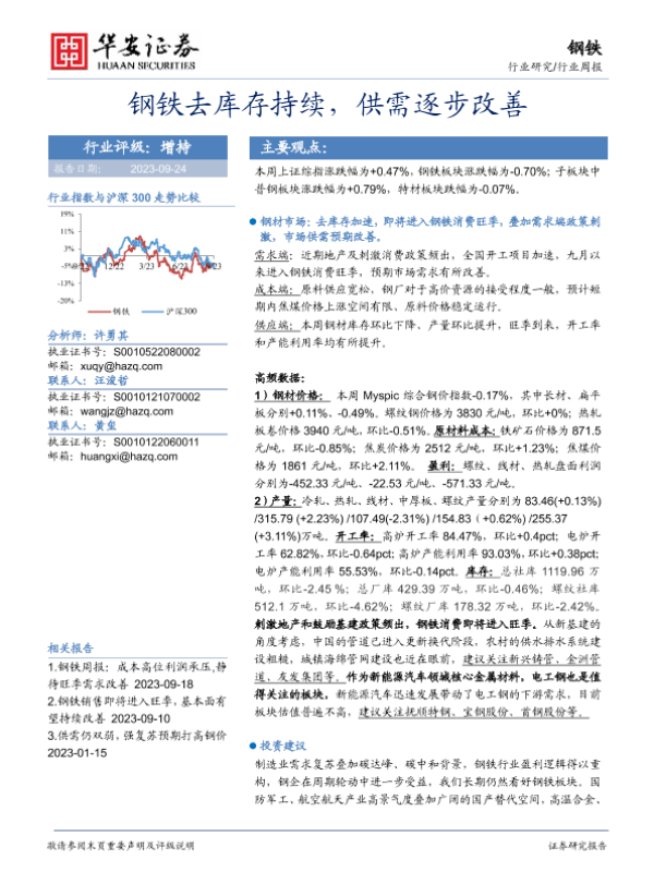 【华安证券】【20230924】20230924-华安证券-钢铁行业周报:钢铁去库存持续,供需逐步改善-13页