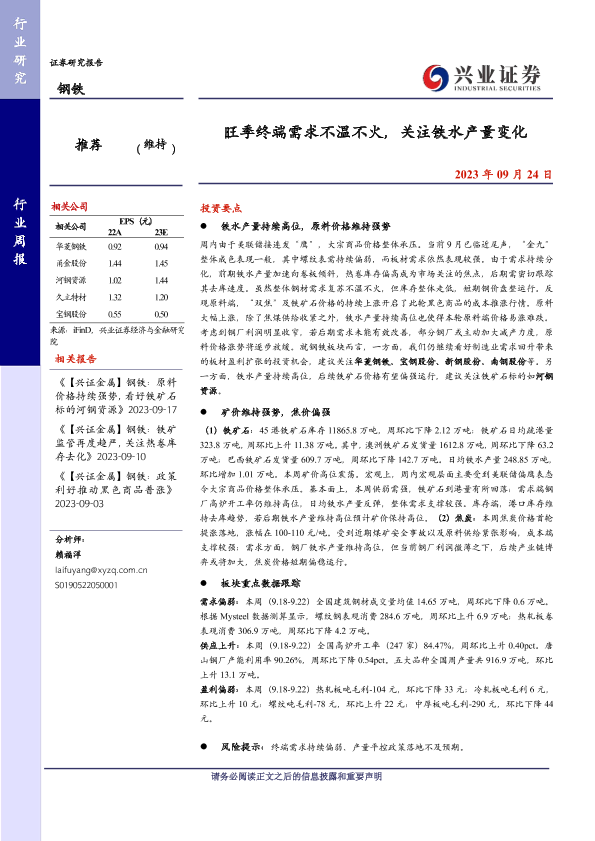 【兴业证券】【20230924】20230924-兴业证券-钢铁行业周报:旺季终端需求不温不火,关注铁水产量变化-12页
