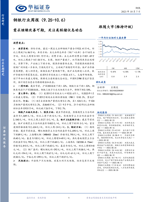 【华福证券】【20231007】20231007-华福证券-钢铁行业周报:需求继续改善可期,关注美联储议息动态-13页