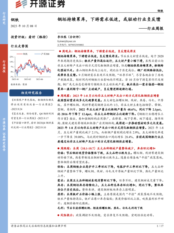 【开源证券】【20231009】20231009-开源证券-钢铁行业周报:钢坯持续累库,下游需求低迷,或驱动行业负反馈-17页