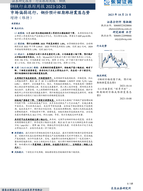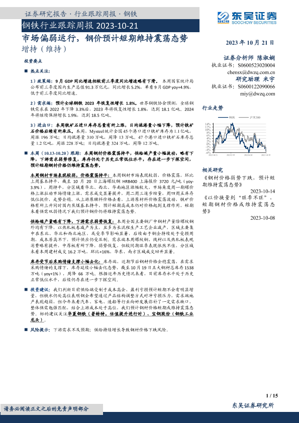 【东吴证券】【20231021】钢铁行业跟踪周报:市场偏弱运行,钢价预计短期维持震荡态势-15页