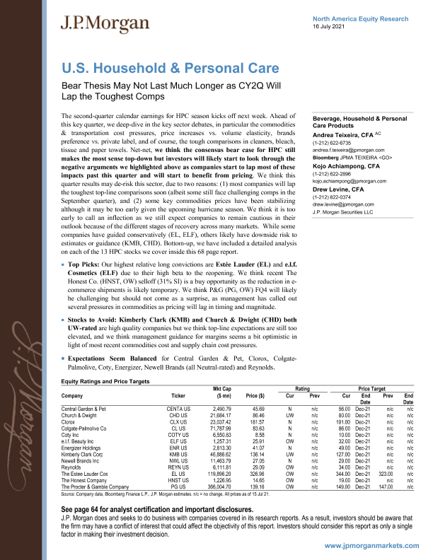 【J.P. Morgan】【20210716】J.P. 摩根-美股零售业-家居和个人护理产品:熊市论题可能不会持续太久-68页
