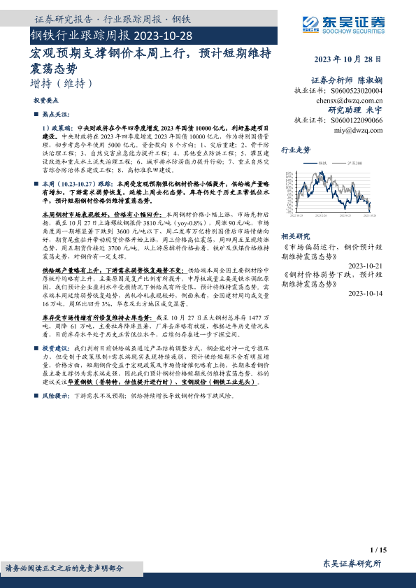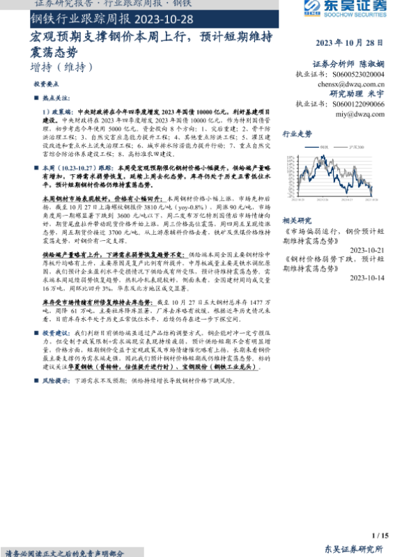 【东吴证券】【20231028】20231028-东吴证券-钢铁行业跟踪周报:宏观预期支撑钢价本周上行,预计短期维持震荡态势-15页