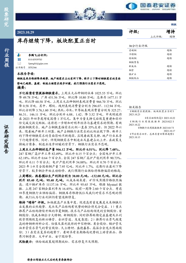 【国泰君安证券】【20231029】20231029-国泰君安-钢铁行业周报:库存继续下降,板块配置正当时-30页