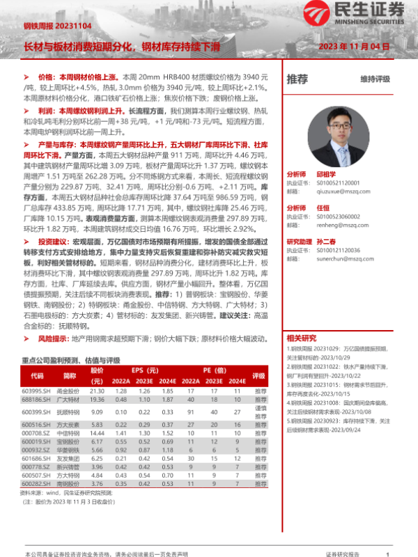 【民生证券】【20231104】20231104-民生证券-钢铁周报:长材与板材消费短期分化,钢材库存持续下滑-20页