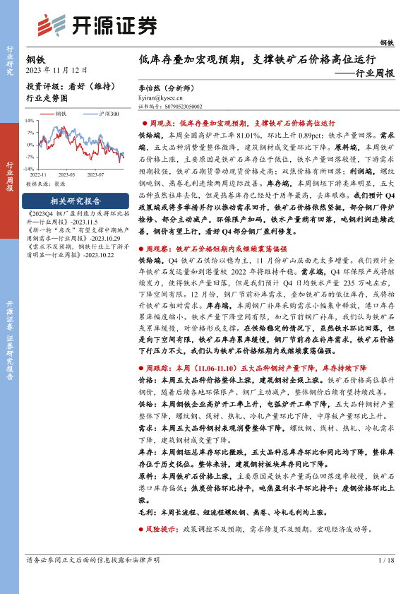 【开源证券】【20231112】20231112-开源证券-钢铁行业周报:低库存叠加宏观预期,支撑铁矿石价格高位运行-18页