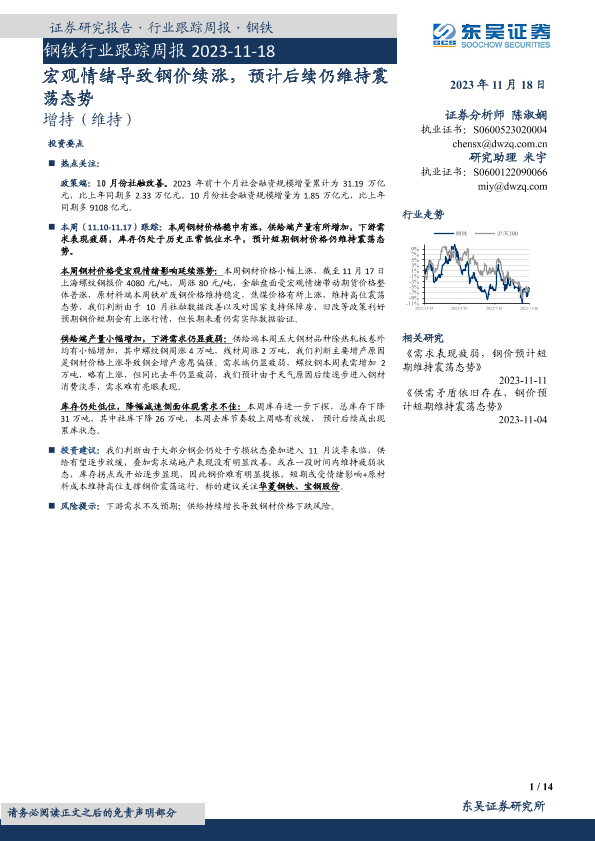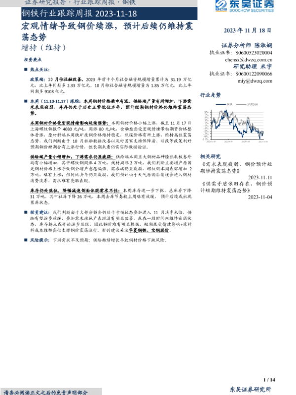 【东吴证券】【20231118】20231118-东吴证券-钢铁行业跟踪周报:宏观情绪导致钢价续涨,预计后续仍维持震荡态势-14页