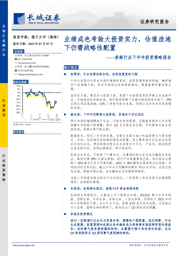【长城证券】【20220707】券商行业下半年投资策略报告:业绩成色考验大投资实力,估值洼地下仍需战略性配置-18页